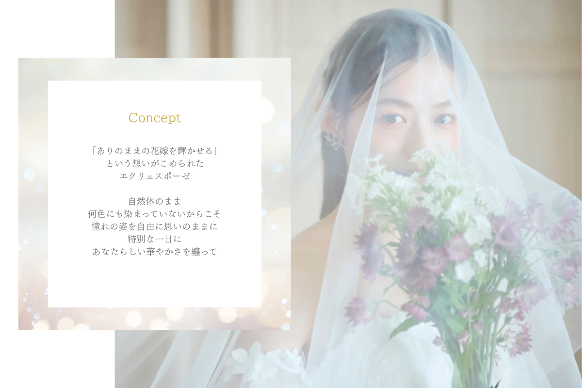 『こんな花嫁様にきっと似合う』『こんなコーディネートをご提案したら喜んでもらえるのでは』と常に考え、ドレスを纏う花嫁様の笑顔を思い浮かべて制作したので、『このドレスに出会えてよかった』と感じていただけるとうれしいです。ecrusposeは、これからも花嫁様一人ひとりの“なりたい”を叶える存在であるために、想いを込めて一着一着をお届けしていきます。